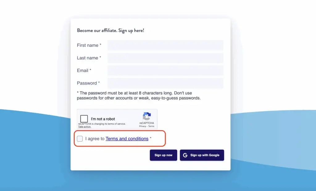 A practical way to manage this is to show your affiliate terms and conditions during signup and require partners to accept them before joining the program.