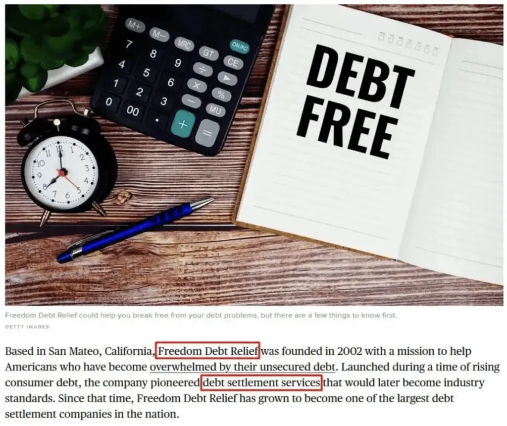 See how the Freedom Debt Relief review does this effectively by using branded keywords like “debt settlement services” in the first paragraph and placing the affiliate link above the fold, ensuring maximum exposure and engagement.