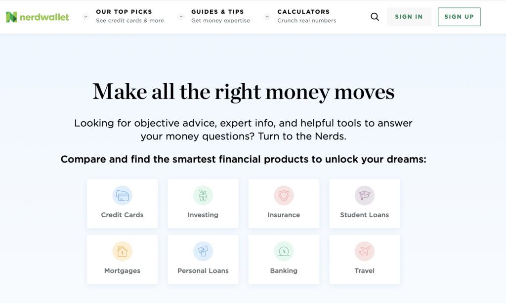 Nerdwallet is a financial review website giving people objective advice on their finances. There are reviews for all types of financial products, including top picks, guides, tips, and calculators.