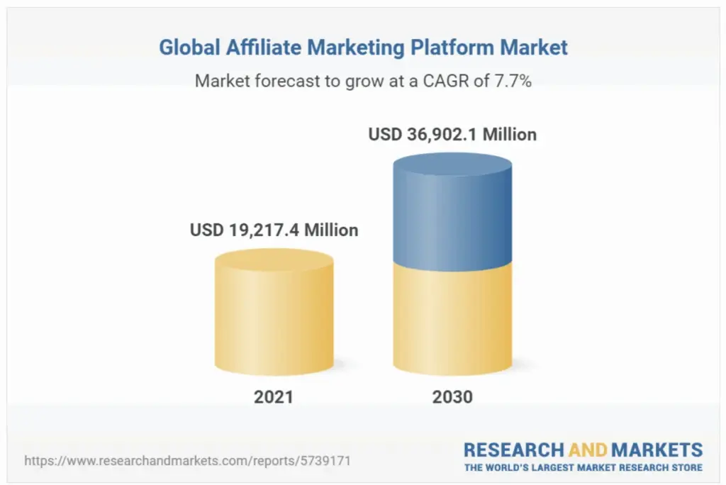 It’s easy to see businesses venture into affiliate marketing. In fact, its worldwide market could grow from $19,217.4 million in 2021 to $36,902.1 million by 2030. Also, it’s forecasted to expand at a compound annual growth rate (CAGR) of 7.7%.