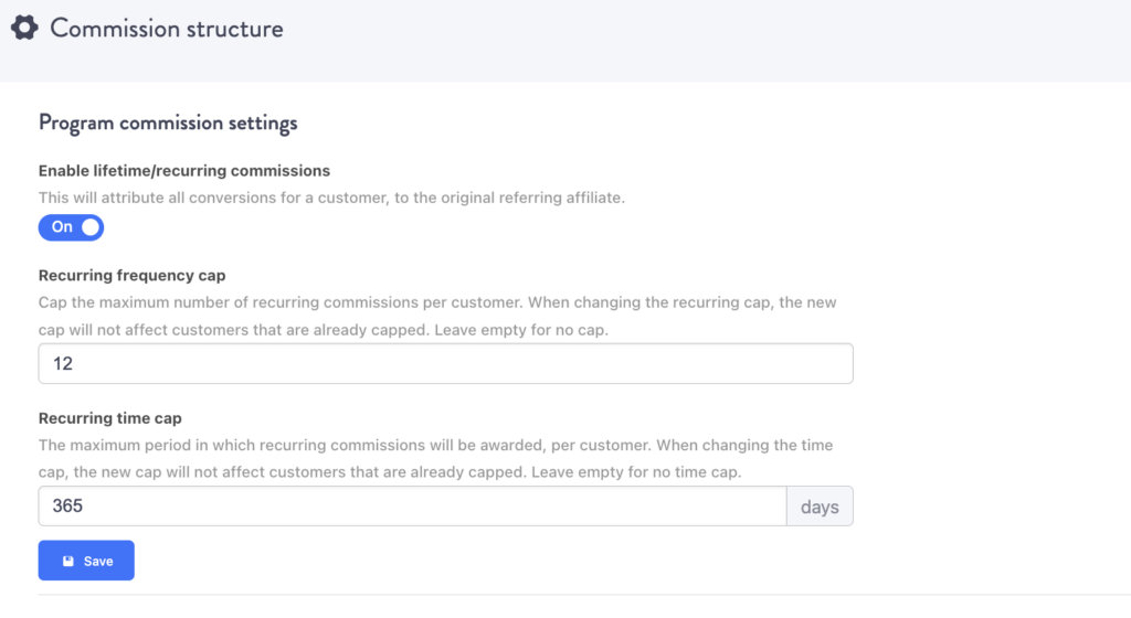For affiliate marketing programs, these look like flexible commissions. Tapfiliate lets you adjust commissions to be flat-fee, percentage-based, recurring, or lifetime. Plus, you can toggle the commission amount and trigger automatic increases based on performance.