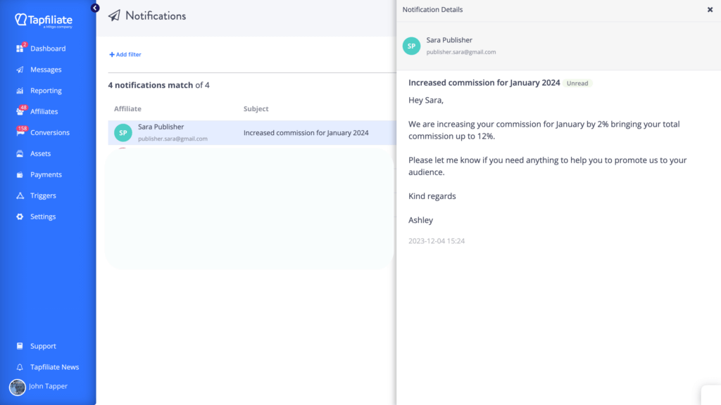 Getting started with the In-Platform Messenger is easy! Log in to your Tapfiliate account, navigate to the ‘Messages’ section, and start engaging with your affiliates in a whole new way. We’re confident that this feature will strengthen relationships, improve communication, and contribute to the success of your affiliate marketing endeavors.