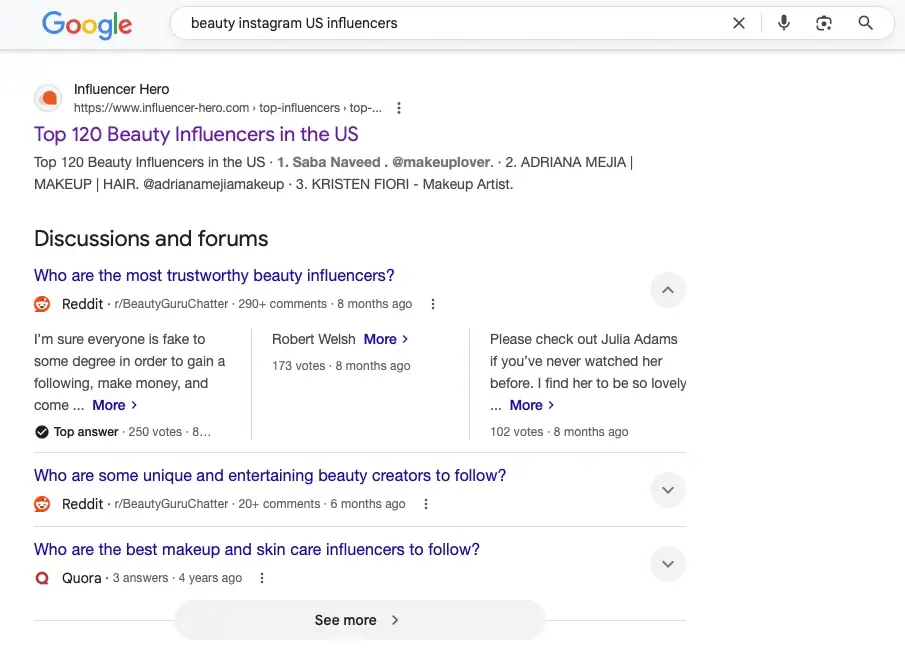 By searching things like “top food influencers in NY,” or “Best Instagram US influencers”, Google can provide you with curated lists of influencers. These lists are often made by agencies, industry publications, or again in sites like Reddit or Quora.