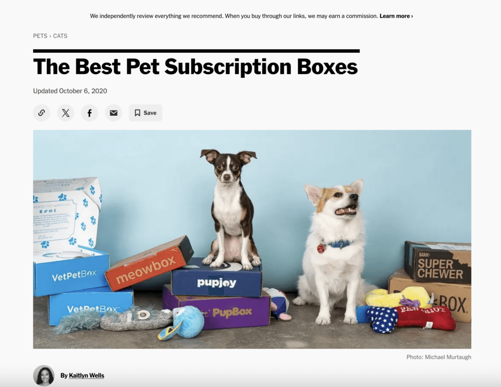 - Content and review websites: You might recognize the New York Times as an American source of editorials and news — but they also run a subset of the site known as the Wire Cutter, which reviews products and shares results with readers. Here’s an example that they covered about pet subscription boxes: