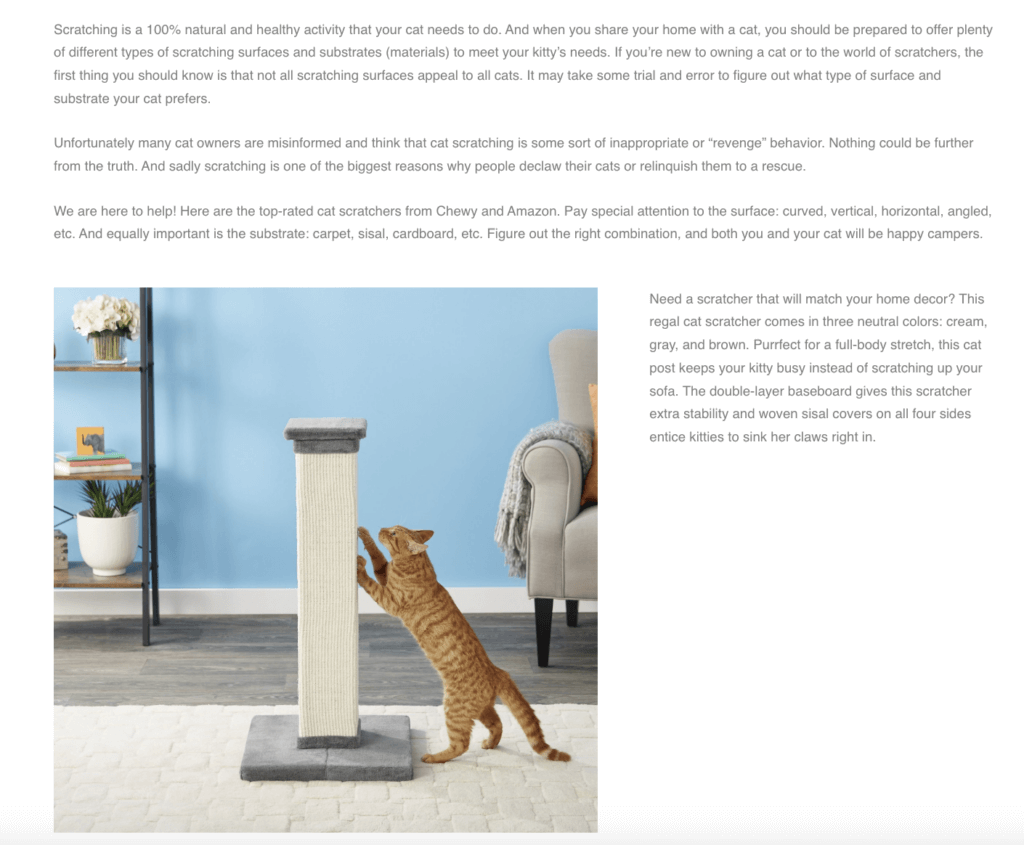 - Pet bloggers: A savvy blogger might run a high-traffic niche blog about traveling with pets, caring for special needs pets, or any other endless theme we could think of in the animal kingdom. This one caters to everything cats, including product reviews, roundups, comparisons, and helpful tips: