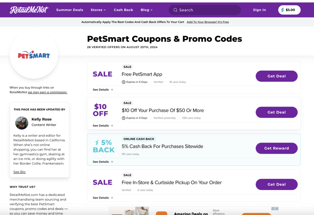 - Coupon websites: These high-traffic sites cater to the bargain hunters online. While coupon and discount sites might demand a higher commission, it’s often worth it for the sheer traffic they can lead to your products. Even PetSmart has an affiliate partnership with famous coupon site, RetailMeNot: